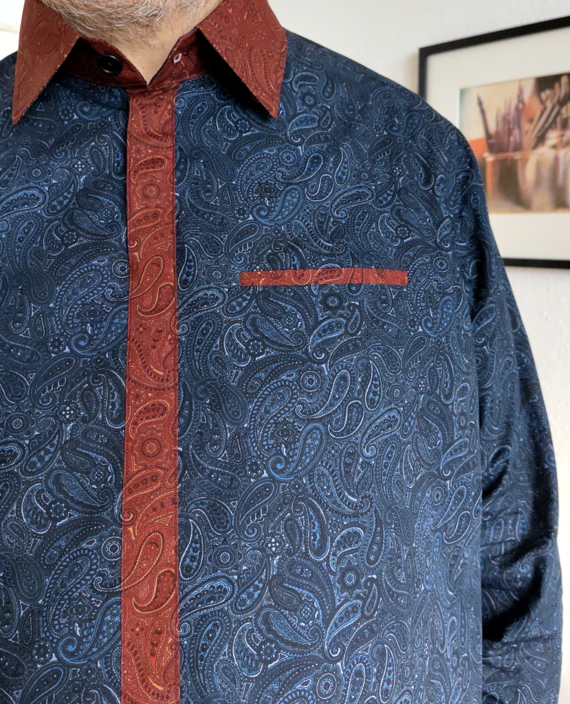 After a busy and productive time, I finished my next Simon shirt. It is the first after the long series of tests, with a blue paisley main fabric and a red detail fabric with the same pattern. It was my first shirt to attempt a welt pocket, and because the pattern of the two fabrics is the same, it takes great care about alignment and non-alignment, and took much longer to make.