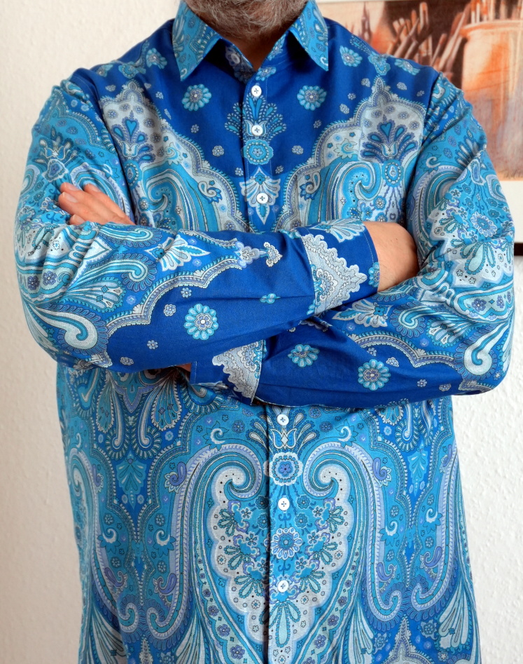 The newest shirt I made is from a fabric I had lying around literally for years. I had known or at least planned for a long time to start sewing, until finally last year, the discovery of this website, the tip from a friend at my local maker space, made it happen. As I said a couple of times: I cannot thank you enough, sewing feels like a superpower. Cutting of this fabric needed quite some preparation, and I waited until I felt confident with the basic sewing business, and also to avoid ruining the fabric by lack of experience.