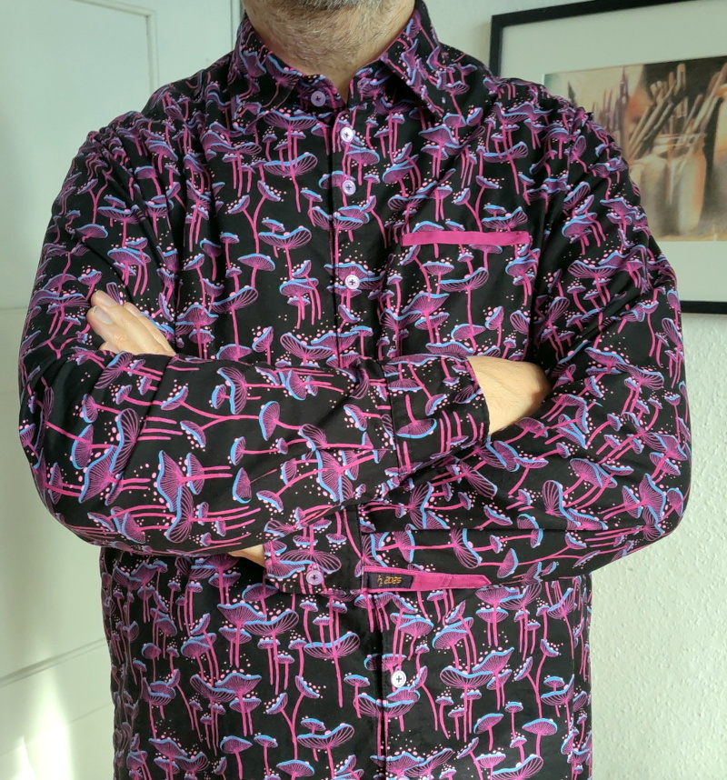 Let’s go chronologically. My spouse had found a very nice mushroom fabric, very good quality Japanese cotton with a crazy magic mushroom print, and gave me a few meters as a present, with the implicit request to make a Simon out of it, of course. I found two matching single colour fabrics in my fabric stash to combine with, and I tried to make the most serious shirt I could with this fabric.