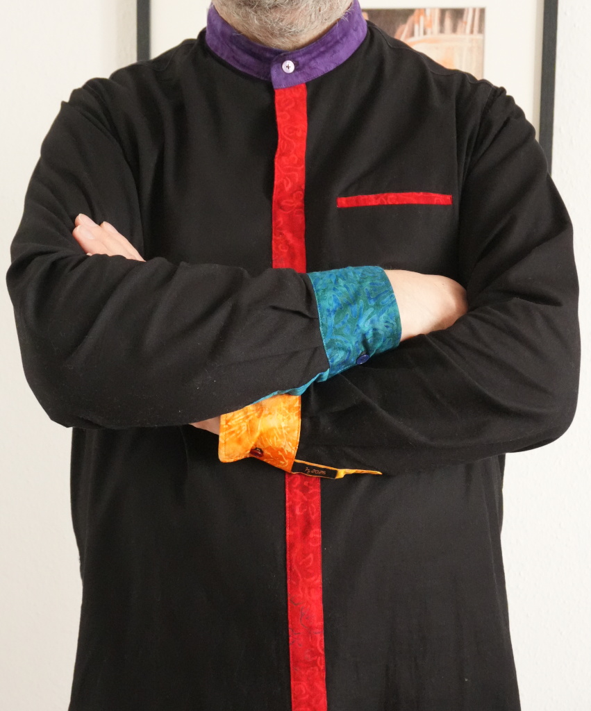 The next shirt was an attempt at a rainbow combined with black, after I had gathered very colour- and beautiful batik fabric during several visits to fabric stores. I wanted a subtle rainbow, but not simply by a sequence of coloured fabrics, so I though combining and contrasting it with black might work well.