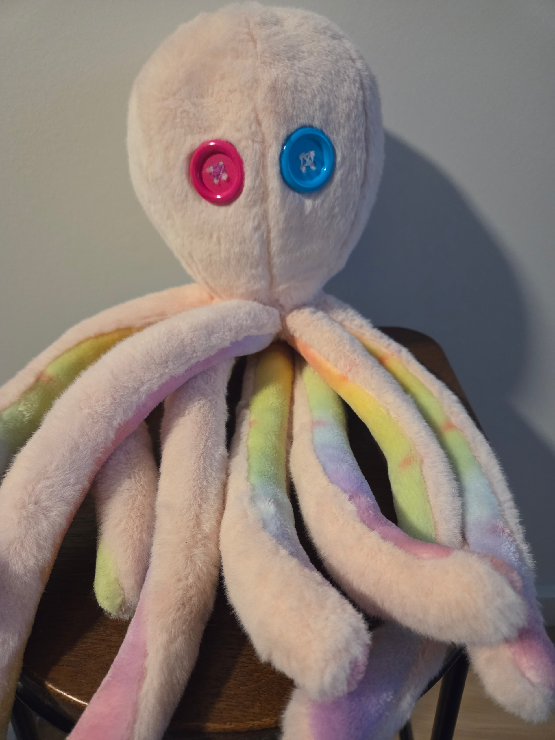It was a gift, so I had the recipient pick out the fabric they wanted. I’d tweaked the pattern to make the arms a bit more curled and modify some other dimensions to make it similar to the one it was replacing. The eyes are probably a little too close together but the recipient doesn’t care, so neither do I! I stuffed the head to the requested firmness which is why it looks so big and round.