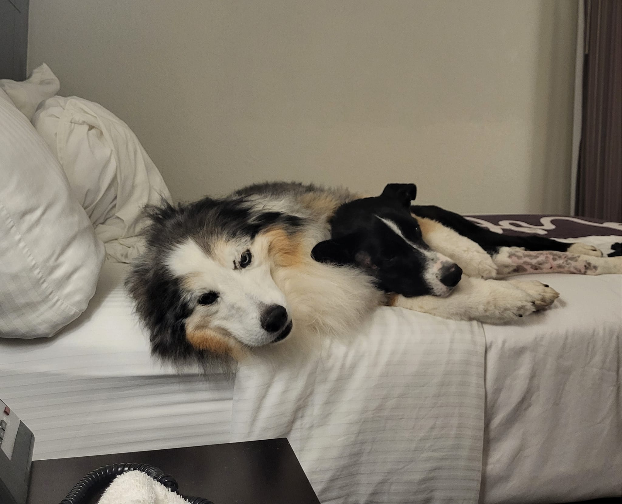 Jack (Black and White - Smooth Coat Border Collie) and Sydney (Blue Merle - Australian Shephard) on the first night heading home, in a hotel from Jack’s rescue from the Dog Pound.