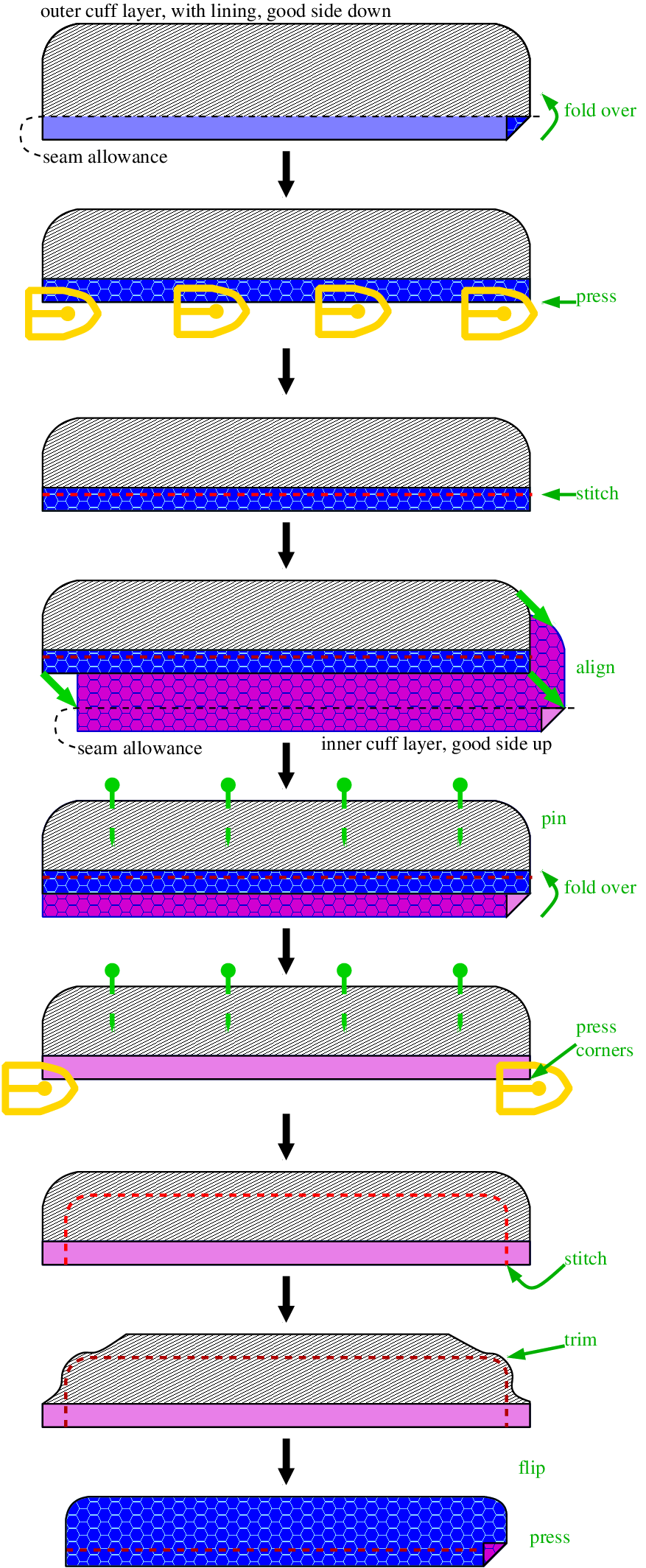 As you might have read in my report on my first Simon, I wanted to experiment with an alternative cuff assembly method, in order to avoid some stressful moments when attaching the sleeves and trying to hide all the open fabric edges in the cuff. Particularly at the edges.