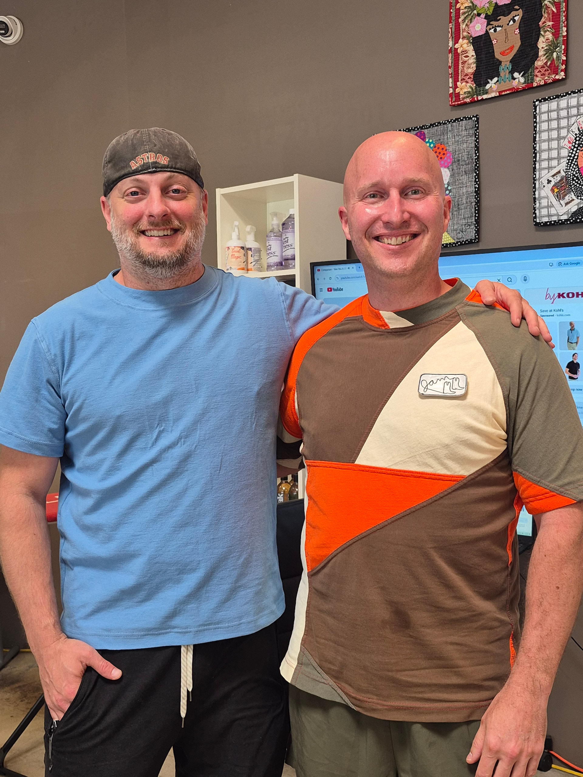 Today I taught a course at my local sewing store in Austin, TX, USA on t-shirt making. I used the Teagan T-Shirt pattern, and the results were amazing. One of my students (pictured on the left) went home wearing the new t-shirt and his wife asked him where the t-shirt was that he made. The t-shirt looked so professionally finished that she didn’t even recognize that he made it, and he had never sewn at all before today. I just wanted to thank everyone who keeps FreeSewing running and working on the designs (Teagan in particular). I love that I am able to bring custom fit to my students and they don’t have to settle for commercial sizing. I have several more t-shirt courses left to teach, and I’m also teaching one this summer using the Charlie Chinos pattern.